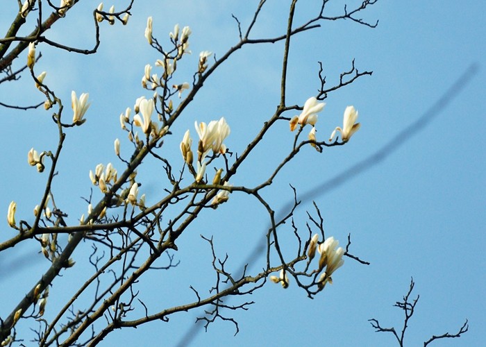 早開的白玉蘭,常常受到暗霜或寒風的凍害,導致其花瓣枯吊枝頭,乃至影響果實的結實。希望近日的“倒春寒”不會凍壞已經綻放的白玉蘭花朵,待到晴日,讓游人欣賞到它們在藍天映襯下的、朵朵向上的潔白身姿。