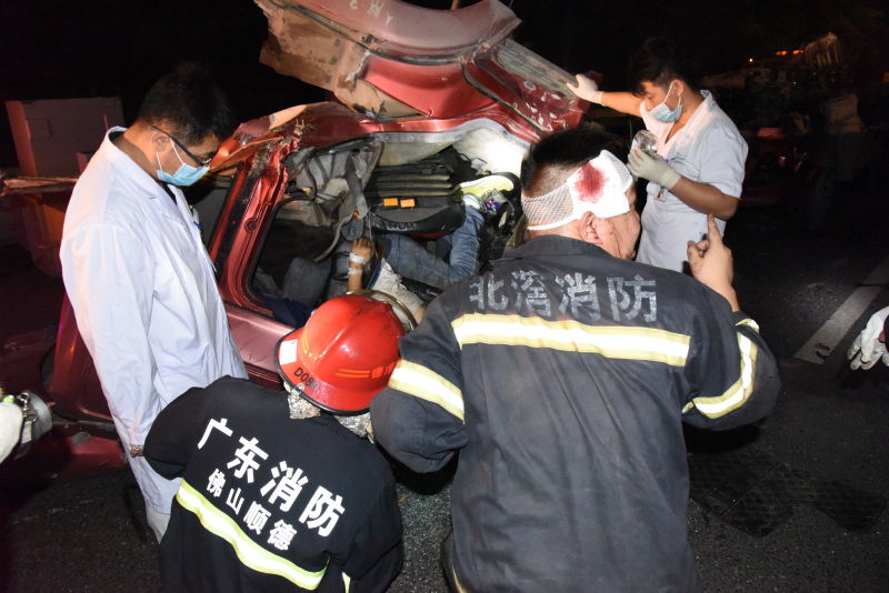 凌晨4時20分,北滘?qū)B毾狸犣s到現(xiàn)場后,發(fā)現(xiàn)現(xiàn)場出事車輛為1輛大拖頭貨車,車上存放一大批質(zhì)量較大的機器設備和貨物,當行駛到出事地點時,由于司機剎車太急,車身里存放的貨物釋放出巨大的緩沖力并沖向駕駛室,駕駛室瞬間被壓垮,司機腹部以下身體被卡,根本無法動彈,現(xiàn)場情況十分危急。根據(jù)現(xiàn)場情況,北滘?qū)B毾狸牭綀鱿狸爢T立即展開救援行動:采用操作液壓擴張器撐開車頭機件,找準鋼索著力點,使用消防車對駕駛室進行牽引,仍無法打開車門,后采用液壓鉗剪斷車門變形部位,操作液壓擴張器進行撐頂使得方向盤不再擠壓司機腹部。隨后,消防隊員拆除駕駛位座椅,使得施救空間變大,為找準司機雙腳受困位置,一名消防隊員脫下頭盔,探頭尋找司機受困部位,導致車內(nèi)金屬機件刮傷頭部,造成一道約7公分傷口,經(jīng)過簡單處理后,再次投身救援。利用液壓擴張器進行撐頂,最后將司機雙腳慢慢抽出并成功救出駕駛室,經(jīng)過兩小時的緊張救援,北滘?qū)B毾狸犼爢T順利將被困人員救出,并小心翼翼的將傷者抬上擔架后由醫(yī)護人員送往醫(yī)院救治。
