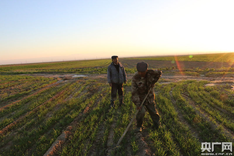 阿黑懂些漢語,他連說帶比劃告訴我:“冬麥正澆拔節水。一些村民澆水不上心,渠水會沖垮地埂,流進戈壁灘。”他用木棒和塑料布制作了一副長擔架,準備把別人浪費的水搭橋引到自家地里澆灌。