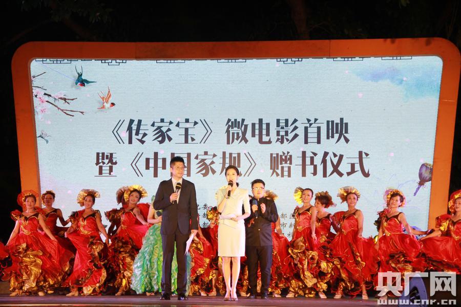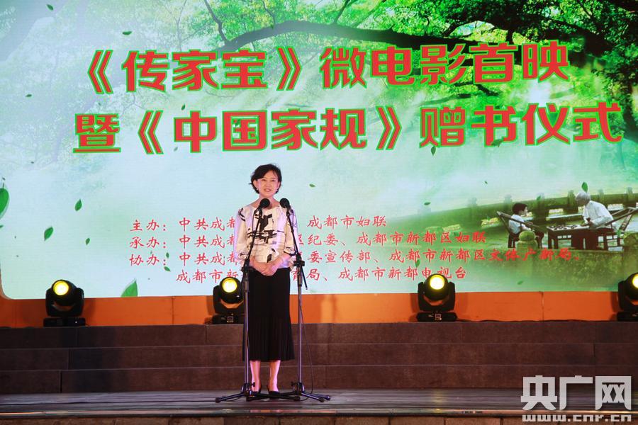 《傳家寶》微電影首映暨《中國家規(guī)》贈書儀式在蓉舉行(央廣網(wǎng)記者 韓民權(quán) 攝) 央廣網(wǎng)成都7月20日消息(記者韓民權(quán))7月20日,由中共成都市紀(jì)委、成都市婦聯(lián)主辦,中共成都市新都區(qū)紀(jì)委、新都區(qū)婦聯(lián)等共同承辦的《傳家寶》微電影首映暨《中國家規(guī)》贈書儀式在成都市新都區(qū)舉行。參加此次活動的人員有鎮(zhèn)(街)、部門機關(guān)代表、“最美家庭”代表、群眾代表共計500余人。 好家風(fēng)是黨員領(lǐng)導(dǎo)干部拒腐防變的一道前沿防線,為進一步發(fā)揮家庭成員在家庭助廉工作中的特殊作用,扎實推進黨風(fēng)廉政建設(shè)和反腐敗工作,成都市紀(jì)委和成都市婦聯(lián)圍繞家風(fēng)家訓(xùn)主題,聯(lián)合打造廉政文化產(chǎn)品《傳家寶》微電影。每一個家庭都應(yīng)該建設(shè)好自己的家風(fēng),傳承好精神上的“傳家寶”,全市廣大家庭將繼續(xù)大力弘揚優(yōu)良家風(fēng),以千千萬萬家庭的好家風(fēng)、好家規(guī)支撐起全社會的好風(fēng)氣,為提升全市全面從嚴治黨工作成效貢獻力量。 在開展的贈書儀式中,成都市紀(jì)委、市婦聯(lián)領(lǐng)導(dǎo)現(xiàn)場向領(lǐng)導(dǎo)干部代表贈送了由中央紀(jì)委監(jiān)察網(wǎng)站匯編的《中國家規(guī)》一書!吨袊乙(guī)》匯集了中國50個古今名人家規(guī)故事,立足于弘揚中華優(yōu)秀文化,注重思想性、知識性、文化性、服務(wù)性,講述家規(guī)故事,展現(xiàn)家國情懷。贈書活動旨在讓受贈者從中汲取規(guī)矩意識、紀(jì)律意識,力求更好地發(fā)揮家訓(xùn)家規(guī)文化的教化作用,促進樹立良好家風(fēng)。 同時,本次活動緊扣當(dāng)前黨風(fēng)廉政建設(shè)和家風(fēng)建設(shè)主題,以本土藝術(shù)家創(chuàng)作的舞蹈《荷頌》、詩歌《五百年的等待》、川劇《拾玉鐲》等弘揚家風(fēng)家訓(xùn)、崇廉尚實的文藝節(jié)目,把本土特色文化融入到文體娛樂活動中,贏得了現(xiàn)場觀眾的陣陣喝彩,進一步弘揚優(yōu)秀傳統(tǒng)文化,傳播了清正廉潔正能量。 據(jù)悉,近年來,成都市婦聯(lián)通過大力推進蓉城女性創(chuàng)優(yōu)創(chuàng)美行動,充分發(fā)揮婦女在傳承良好家風(fēng),弘揚家庭美德中的獨特作用推進廉潔文化進家庭,開展、“傳家風(fēng)、立家規(guī)、樹新風(fēng)”系列主題活動,突出以家風(fēng)帶民風(fēng)、促政風(fēng)、樹新風(fēng),推動了黨風(fēng)政風(fēng)社風(fēng)向善向上。