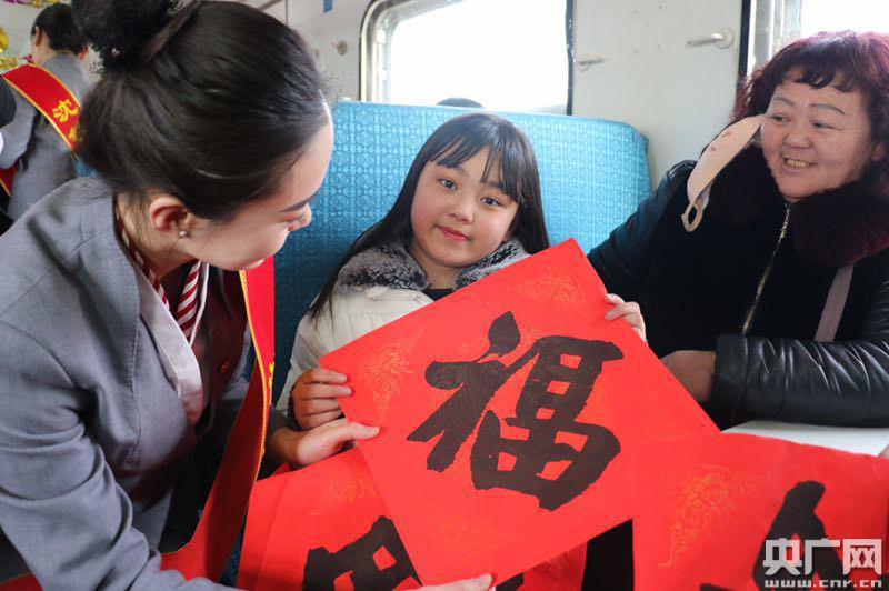 7:20分,隨著一聲汽笛長鳴,K7595次列車緩緩駛離白城站,車廂內(nèi)隨即響起青春動感的旋律。這是一趟全程運(yùn)行在高寒地區(qū)靠燒鍋爐取暖的“綠皮車”。走進(jìn)車廂,濃濃的年味兒迎面撲來,車窗上挨排粘著窗花、福字兒,在行李架上系著拉花和氣球,充滿節(jié)日氣氛。開車不久,車上的志愿者們開始把“福”字,春聯(lián)和春運(yùn)安全手冊、暖貼等分送給旅客。旅客張先生告訴記者,這些東西不大,但拿在手上暖在心里。他說:“在外忙活了一整年,一踏上回家的列車,就收到福字,還有暖貼。禮輕情意重。”
