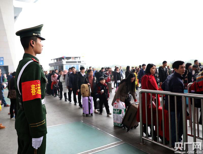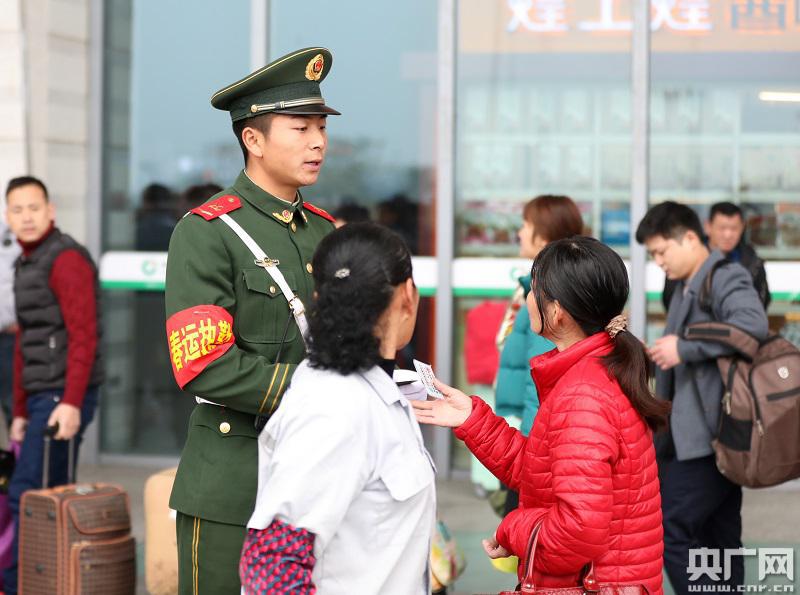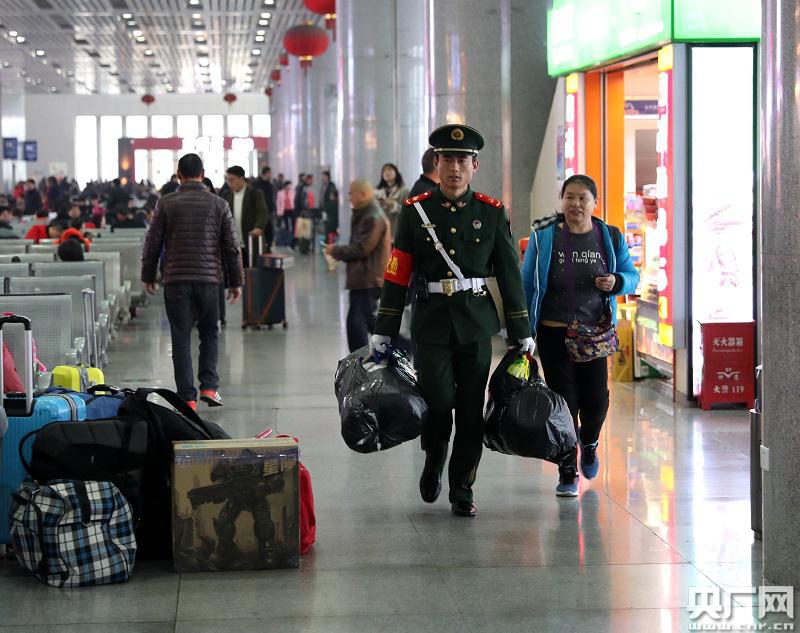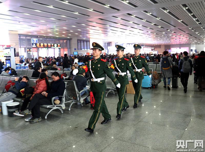 央廣網泉州2月14日消息(記者彭建軍 通訊員彭勇 莊標)春運期間,隨著務工人員紛紛返鄉,車站客流量出現高峰,在福建泉州動車站,負責車站春運執勤的武警官兵認真履職的同時,為旅客提供熱情周到的便民服務,用實際行動溫暖旅客回家路。