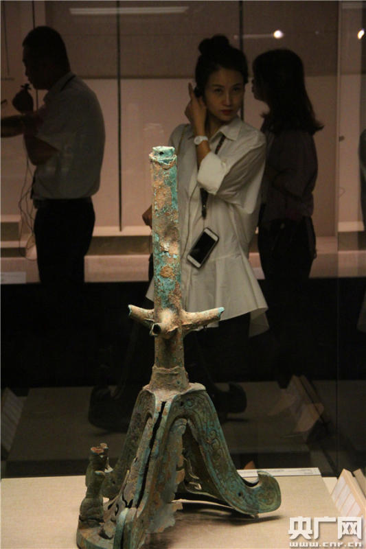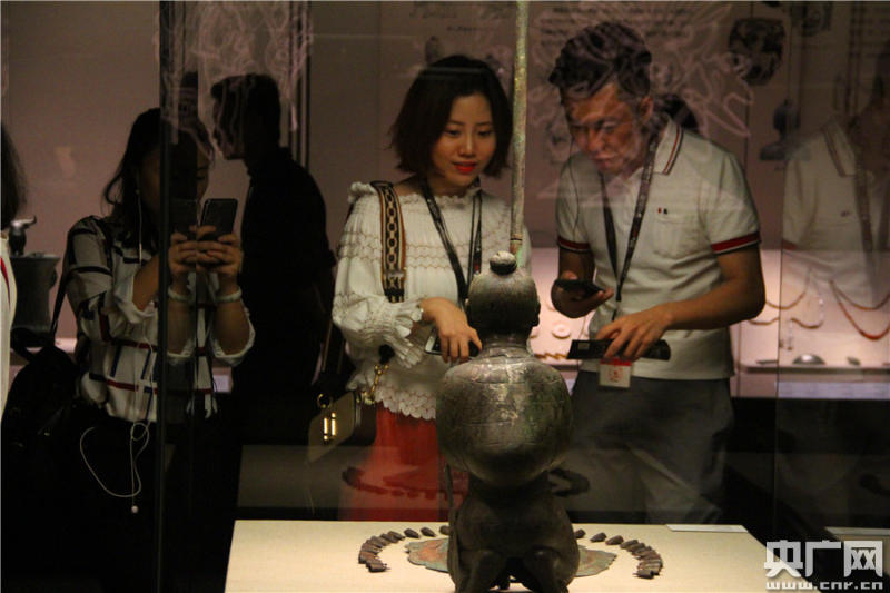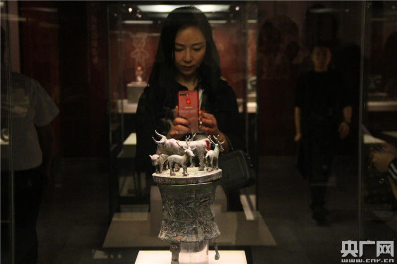 一名觀眾在欣賞“戰(zhàn)國時(shí)期的虎鹿牛銅貯貝器”(央廣網(wǎng)發(fā) 記者賈宜超攝)