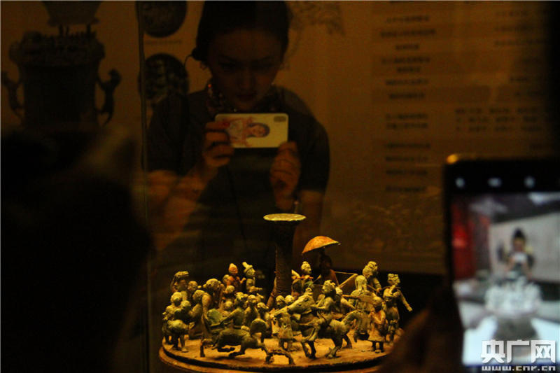觀眾在欣賞“西漢時(shí)期的執(zhí)傘跪坐俑”(央廣網(wǎng)發(fā) 記者賈宜超攝)