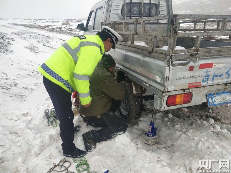 交警幫助被困司機安裝防滑鏈 央廣網發 瑪多交警供圖