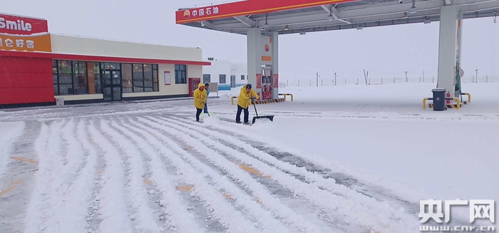 清理加油站內(nèi)積雪(央廣網(wǎng)發(fā) 圖片由中國(guó)石油青海銷售公司提供)