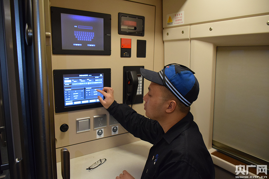徐海洋正在復興號監控室測試旅客服務信息系統播報情況(央廣網發 萬新 攝)