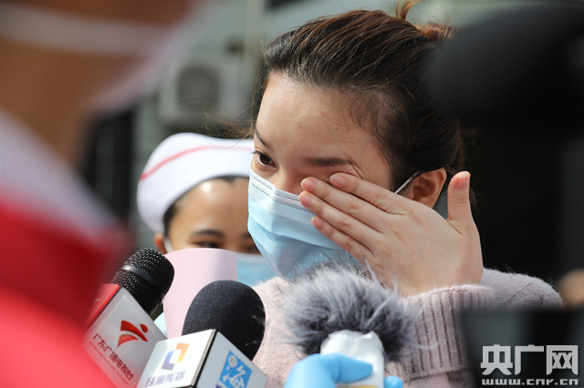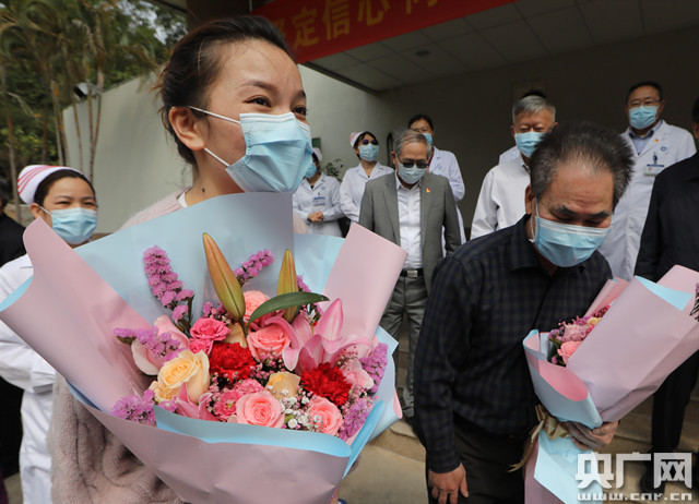 上午10點30分,當兩名患者走出病區,護士代表立即送上了鮮花。34歲的女患者陸某一直在擦眼淚,另一名患者羅老伯用廣東話不停表達自己的感謝!盎厝ズ笠欢ㄒ⒁庑菹ⅲV睾蒙眢w”,中大五院院長單鴻向他們送上祝福。