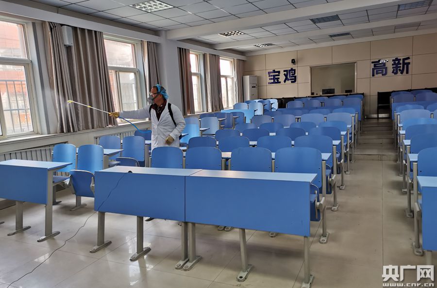 圖為寶雞市石油中學(xué)對(duì)教室進(jìn)行消殺(央廣網(wǎng)記者 舒隆煥 攝)