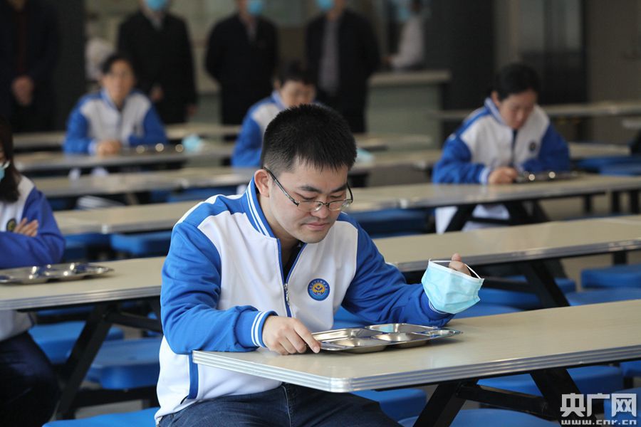 圖為西咸新區(qū)灃東新城車輛中學(xué)演練模擬學(xué)生規(guī)范就餐(央廣網(wǎng)記者 舒隆煥 攝)
