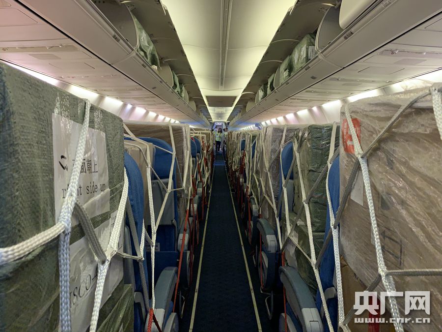 “客改貨”后,客機客艙內裝滿了防疫物資(央廣網發 通訊員供圖)