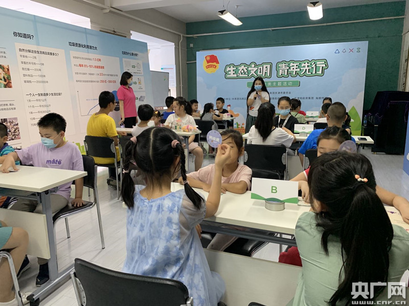 小志愿者們在游戲中學習垃圾分類知識(央廣網(wǎng)記者 楊煜 攝)