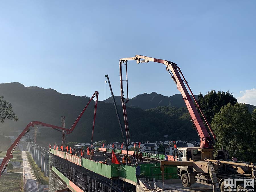 休寧河特大橋位于安徽省休寧縣境內,是昌景黃鐵路全線重要控制性工程之一。此次施工的橋梁上跨205國道,梁面跨度64米、寬12.6米,是目前國內在建最大跨度高速鐵路現(xiàn)澆簡支梁。