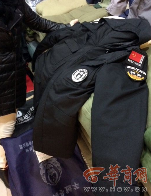 “老板有執(zhí)勤服沒?”“有啊。160元一套。”記者發(fā)現(xiàn)在衣服內(nèi)側(cè)口袋上赫然印著“警用冬執(zhí)勤服”的字樣,衣服襯里和紐扣上印有警察英文“police”字樣。在名為“磊鑫軍品經(jīng)銷部”一名中年女子熱情的推銷著,“兄弟,這是最新的特警服,305元一套。”她又拿出一件大衣,記者發(fā)現(xiàn)所謂的特警服與真正的特警服從外觀上看并無差異,只是沒有警銜、胸徽、警號等警用標志。
