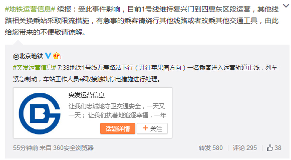 央廣網北京3月2日消息 據北京地鐵官方微博報道,3月2日早7:38,北京地鐵1號線萬壽路站下行(開往蘋果園方向)一名乘客進入運營軌道正線,列車緊急制動,車站工作人員采取接觸軌停電措施進行處理。