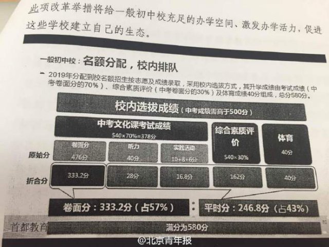 2019 年各校 50% 升入優(yōu)質(zhì)高中的機會,什么樣的學(xué)生可以獲得?按照政策要求,學(xué)生的中考成績達(dá)到 500 分,且在同一學(xué)校具有連續(xù)三年學(xué)籍,才可參加 50% 優(yōu)質(zhì)高中的名額分配。將采取校內(nèi)選拔的方式,錄取成績?nèi)砸灾锌?580 分計,由中考文化課成績、初中綜合素質(zhì)評價成績、體育成績組成,其中,中考文化課和初中綜合素質(zhì)評價成績滿分 540 分,按 7:3 比例計入,體育滿分為 40 分。(北青報記者 林艷 張昆龍)