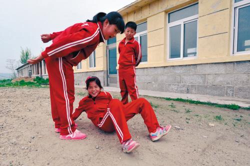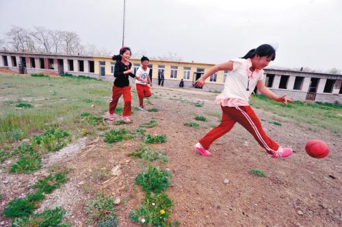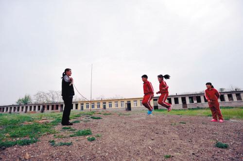 三名學生在校舍前的荒地上玩著“跳格子”游戲,游戲中投擲用的布口袋被隨手撿來的石塊替代。學生校服上的“蘇子峪小學”字樣是這個學校的唯一文字標識。男孩名叫金恒宇,是這個學校和班級里唯一的男生。金恒宇玩起這原本不是男孩子的游戲時,也顯得十分熟練。董思沂和張欣逸專注地看著金恒宇的每個動作,如有違規就會被她倆中的一位替換下來。三人互為裁判,玩得認真而開心。游戲間,一位村民趕著幾十只山羊穿過,學生們看上去儼然已經習慣了這樣的場面。山羊在操場上還忙著啃上幾口青草,隨后被陸續趕進隔壁荒廢的教室,山羊過后在草地上留下散落的“羊糞蛋”。