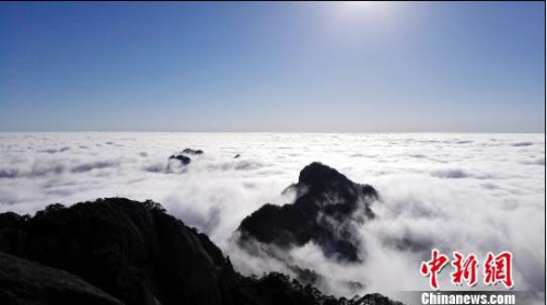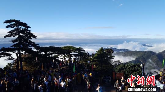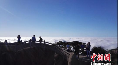3日,黃山風景區迎來客流高峰,截至當日16時,共接待游客32829人。當日,海拔1600米以上的玉屏樓、光明頂、始信峰等地,均出現了浩瀚的云海。 余盛明 攝