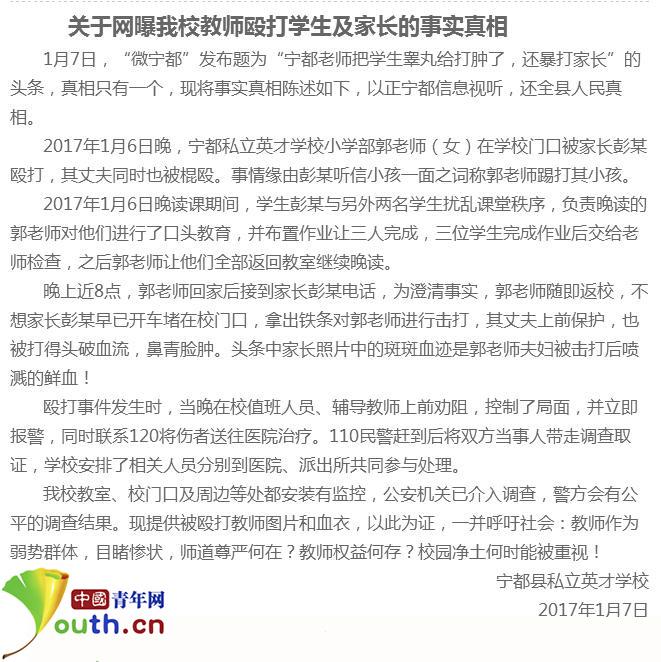 記者隨后致電寧都英才私立學校進行求證,該校政教處張老師告訴記者,事情緣由家長彭某聽信小孩“遭到老師踢打”所致。但真正被打的其實是該校老師,有關爆料中所述家長臉上的血是被打老師流的血。昨天晚上學生家長已經被警方帶走。此事被一些自媒體不經核實轉發,導致不實消息在網絡擴散。