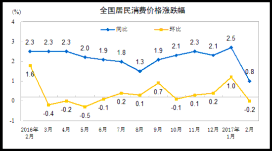 同比來看,2月份CPI上漲0.8%。其中,城市上漲0.9%,農村上漲0.6%;食品價格下降4.3%,非食品價格上漲2.2%;消費品價格下降0.1%,服務價格上漲2.4%。1-2月平均,全國居民消費價格總水平比去年同期上漲1.7%。