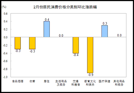 2月份,其他七大類價格環比兩漲三降兩平。其中,居住、醫療保健價格分別上漲0.4%、0.3%;教育文化和娛樂、交通和通信、衣著價格分別下降0.9%、0.4%、0.3%;生活用品及服務、其他用品和服務價格持平。