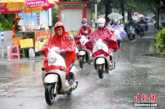 6月16日,廣西柳州市遭暴雨侵襲,民眾穿著雨衣騎電動車出行。 中新社記者 朱柳融 攝