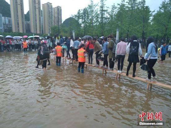 6月15日,受強降雨影響,貴州省六盤水市鐘山區六盤水師范學院部分低洼處路面積水。中新社記者 鐘欣 攝