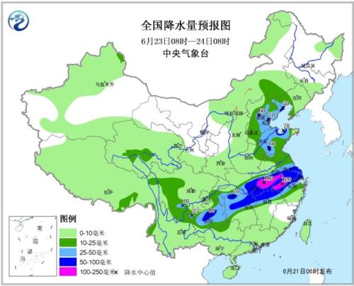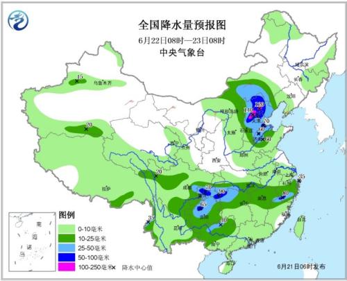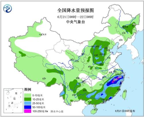 全國降水量預報圖(6月21日08時-22日08時)