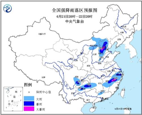 中央氣象臺6月21日18時發布暴雨黃色預警:預計,6月21日20時至22日20時,山西北部、河北大部、北京、天津西部、內蒙古中部偏南等地的部分地區有大到暴雨,其中北京西南部、河北中部等地局地有大暴雨(100~140毫米)。