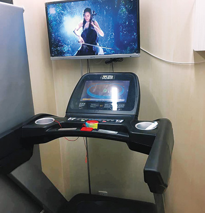 共享運動倉內的跑步機和電視。本報記者 劉 峣攝