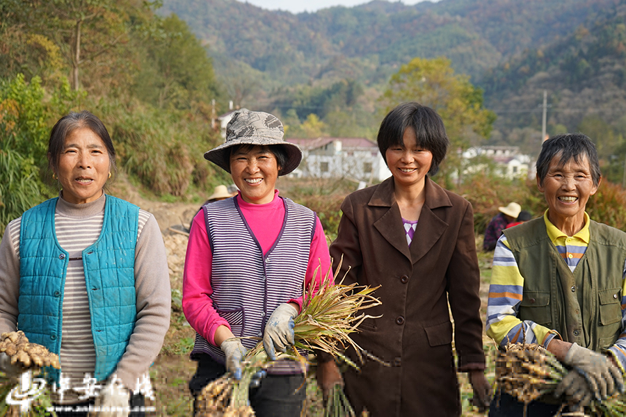 從左至右依次是:大戶王榮彩,2017年預脫貧戶汪麗、汪大云;2016年脫貧戶陳堯美。王榮彩今年61歲,是村中有名的生姜達人;汪麗今年45歲;汪大云今年39歲;陳堯美今年65歲。以上4人都在“三變”改革示范點,村集體經濟,生姜扶貧示范基地務工。汪麗說,“這是我們村的生姜田地,我們幾個姐妹邊工作邊唱歌,一天能領一百塊錢的收入,很開心。”