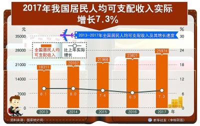 2017年,全國居民人均可支配收入實際增長7.3%,增速比上年加快1個百分點,快于國內生產總值增速0.4個百分點。國內游客人次比上年增長12.8%,國內旅游收入增長15.9%,國內居民因私出境增長5.7%。
