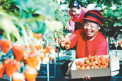 為幫助農(nóng)民增收致富,北京市密云區(qū)積極培育能夠使用“互聯(lián)網(wǎng)+”技術(shù)的新型農(nóng)民,并幫助他們與成熟的電商平臺對接,采取“訂單—備貨—宅配”的模式銷售農(nóng)產(chǎn)品,使得農(nóng)民足不出村就能輕松把農(nóng)產(chǎn)品賣掉,而且價格比市場上高出不少。圖為密云區(qū)十里堡鎮(zhèn)農(nóng)民蒙香梅根據(jù)預售訂單,采摘在市場上頗受青睞的“紅顏”草莓。