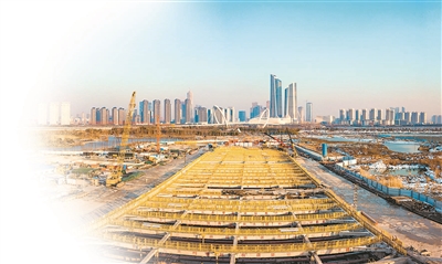 南京長(zhǎng)江五橋江心洲隧道工程施工現(xiàn)場(chǎng),一排排黃色的支架在夕陽(yáng)下顯得十分壯觀(guān)。宋嶠 攝