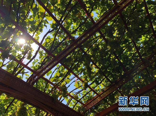 阿急葉木家的庭院里,葡萄藤搭起了遮陽的蓬。新華網 盛元攝