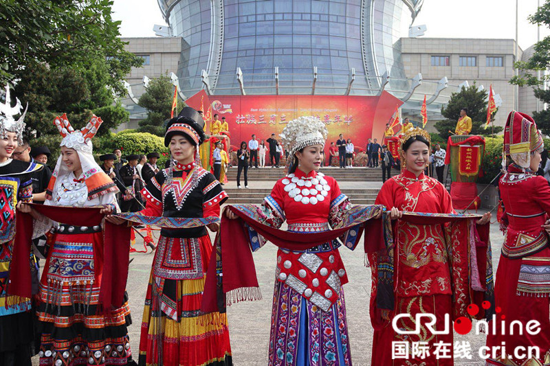 廣西世居民族盛裝女子組成歌陣唱響迎客歌。(圖片來源:國際在線)