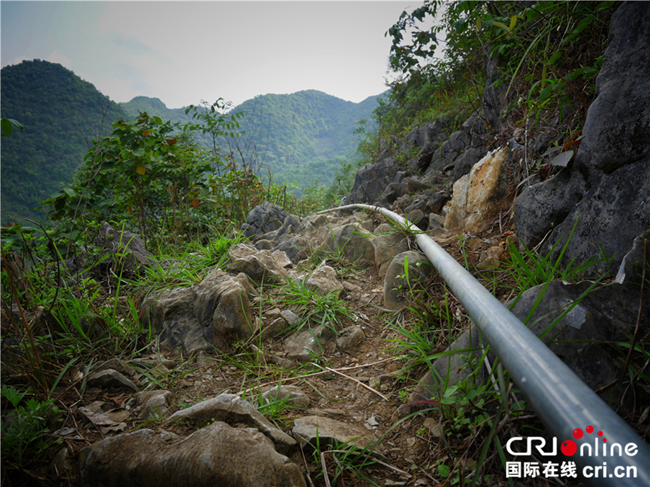 “幸福泉”工程鋪就的水管,用來將山泉水引到廣西河池市大化瑤族自治縣板升鄉八好小學。(圖片來源:國際在線)