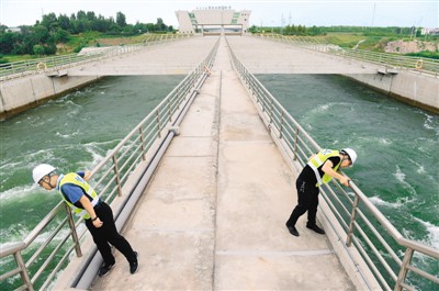 2018年8月14日,南水北調中線干線滎陽管理處工作人員在南水北調索河渡槽附近巡查渠道安全。新華社記者 魯 鵬 攝
