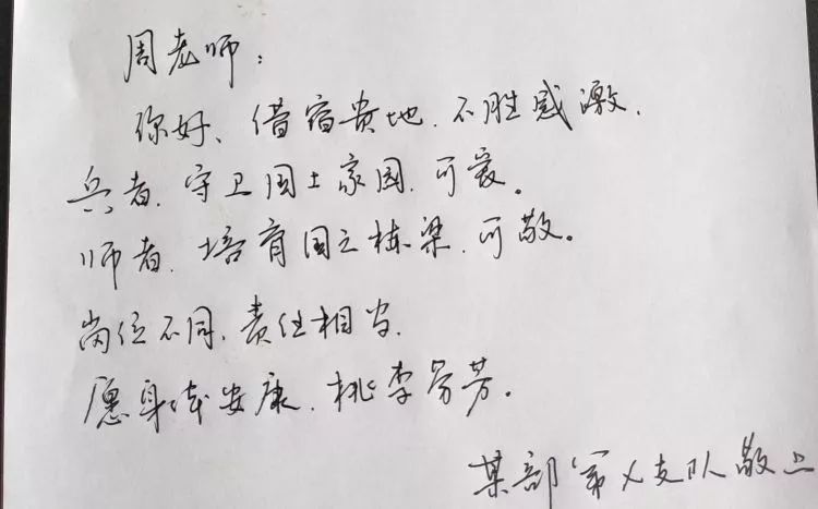 第二天早上,周老師趕到學校,發現辦公室里干凈整齊,如同原樣。他沒有見到武警官兵,但在那張白紙上,多了一段“回復”: