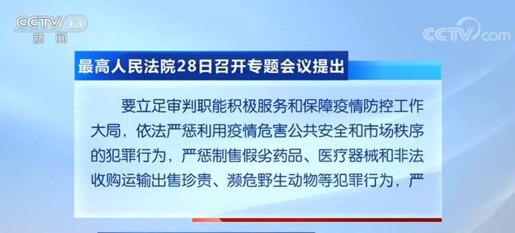 最高人民法院昨天(28日)召開專題會議提出,要立足審判職能積極服務和保障疫情防控工作大局,依法嚴懲利用疫情危害公共安全和市場秩序的犯罪行為,嚴懲制售假劣藥品、醫療器械和非法收購運輸出售珍貴、瀕危野生動物等犯罪行為,嚴懲借機造謠傳謠、暴力傷醫等犯罪行為,堅決維護社會大局穩定。要依法妥善處理涉及疫情相關案件,依法保障人民群眾合法權益。
