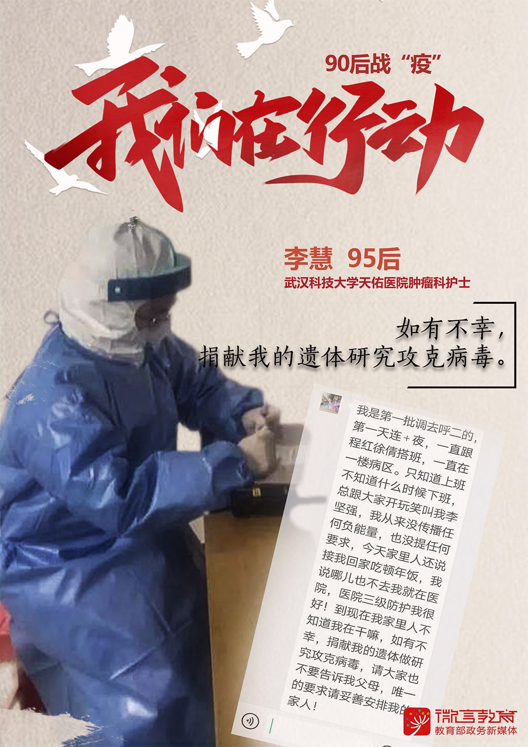 李慧在醫(yī)院征集志愿者時(shí),給護(hù)理部發(fā)了一段話,要求到任務(wù)較重的呼吸二病區(qū)參與一線工作,并要求不要告知家人。