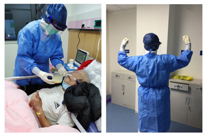 記得剛開始穿防護(hù)服進(jìn)病房,小伙伴們緊張害怕,緊張自己的防護(hù)服是否嚴(yán)密包裹自己,是否有任何暴露的風(fēng)險(xiǎn)。害怕的是,因?yàn)槭堑谝淮谓邮詹∪耍芊窈侠戆才藕霉ぷ髦刃,能否可以和病人順利交流等諸多問題。隨著時(shí)間的推移,在摸索中一步步前進(jìn),轉(zhuǎn)眼間,一個(gè)月快過去了,我們已經(jīng)適應(yīng)了穿防護(hù)服的日子,適應(yīng)了每天過的跟打仗似的日子。