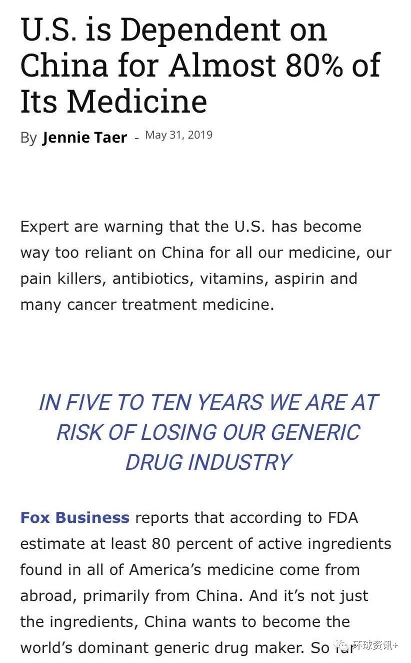美國也不乏類似“脫鉤”的言論。美國國會眾議院外交事務委員會共和黨議員麥考爾曾在一年前表示,要審視美國的供應鏈,美國80%的藥品原料供應來自中國。