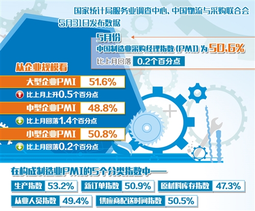 5月份,制造業(yè)PMI為50.6%,比上個(gè)月小幅回落0.2個(gè)百分點(diǎn),但連續(xù)3個(gè)月處于榮枯線上方。在制造業(yè)采購(gòu)經(jīng)理調(diào)查企業(yè)中,81.2%的企業(yè)已達(dá)到正常生產(chǎn)水平的八成以上。