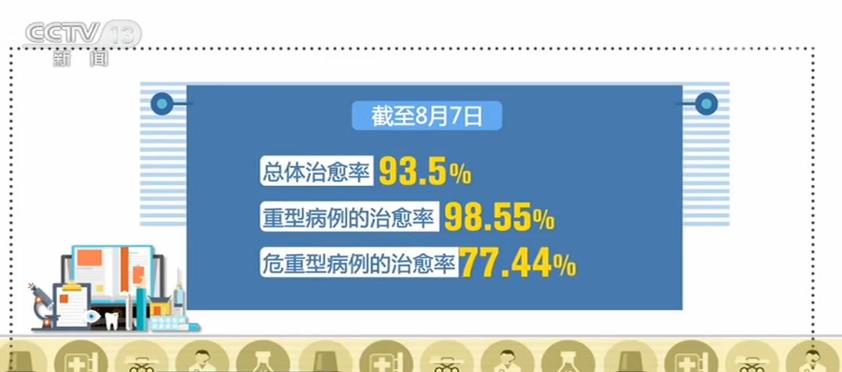 截至8月7日,全國新冠肺炎總體治愈率達到93.5%,重型病例的治愈率達到98.55%,危重型的治愈率達到77.44%。