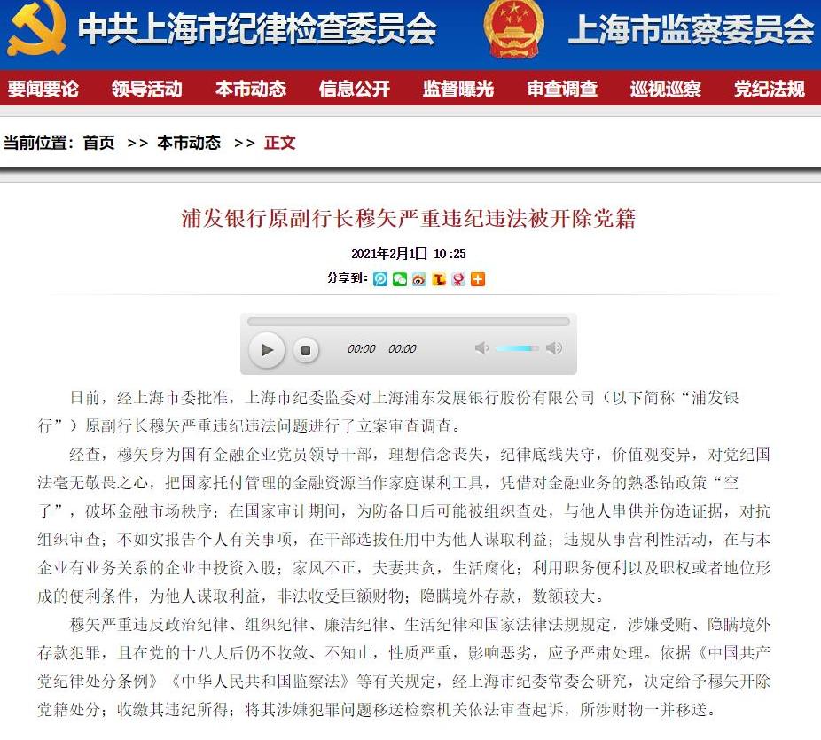 據上海市紀委監委消息:日前,經上海市委批準,上海市紀委監委對上海浦東發展銀行股份有限公司(以下簡稱“浦發銀行”)原副行長穆矢嚴重違紀違法問題進行了立案審查調查。