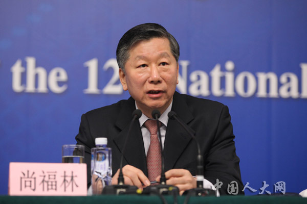 3月11日上午,十二屆全國人大二次會議在梅地亞中心舉行記者會,中國人民銀行行長周小川等五位嘉賓就“金融改革與發展”的相關問題回答中外記者的提問。圖為中國銀行業監督管理委員會主席尚福林回答記者提問。羅榮 攝