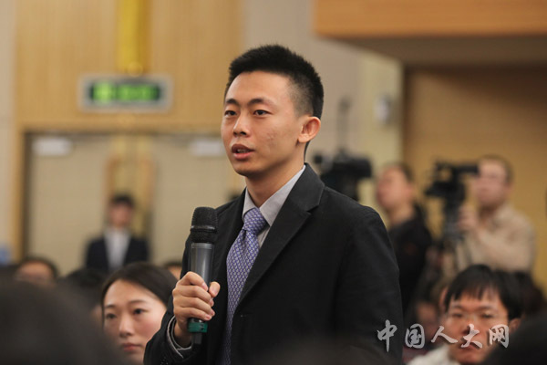 3月11日上午,十二屆全國人大二次會議在梅地亞中心舉行記者會,中國人民銀行行長周小川等五位嘉賓就“金融改革與發展”的相關問題回答中外記者的提問。圖為中央電視臺、中國網絡電視臺記者提問。羅榮 攝