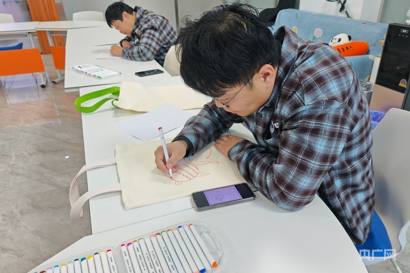 工坊內,大家正在繪制帆布包上的圖案(央廣網(wǎng)發(fā) 韓志亮 攝)