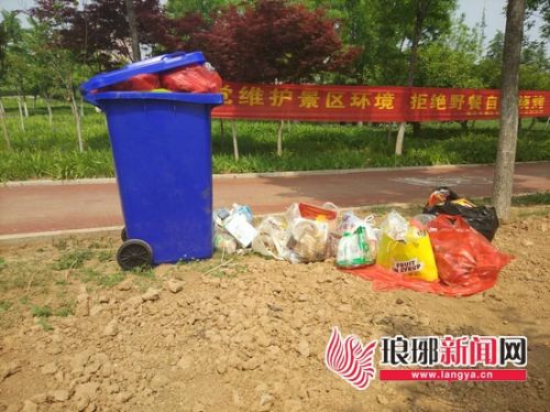 在濱河景區暢園內,沂蒙晚報記者看到隨處懸掛著“自覺維護景區環境,拒絕野餐自助燒烤”的紅色條幅。在路邊一處垃圾桶旁,沂蒙晚報記者看到,藍色的垃圾桶里已經裝滿了垃圾,垃圾桶的蓋子都蓋不上了,垃圾桶旁邊是一袋袋的垃圾。